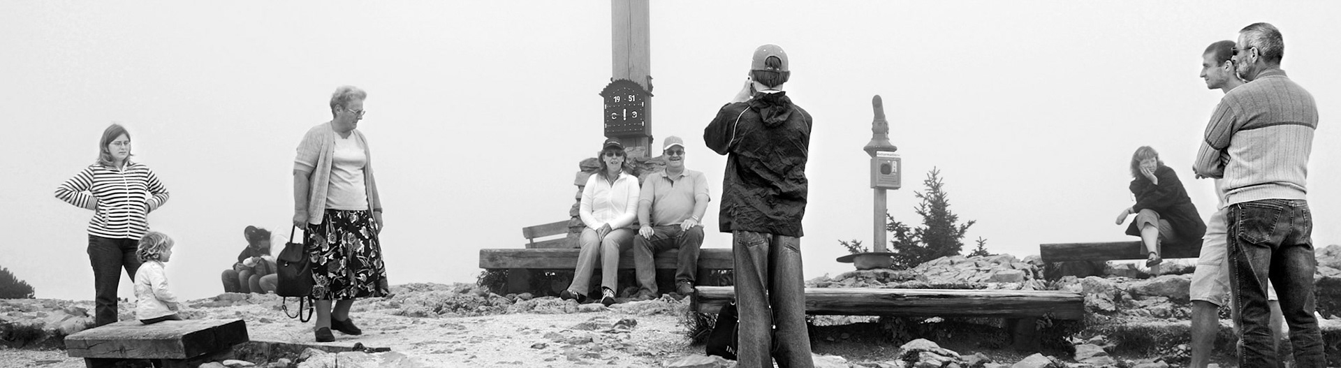 Die zwei ausgestellten Schwarz-Weiß-Aufnahmen stehen dazu im Gegensatz. Sie bilden den Abschluss der ersten urbanen Arbeitsperiode. Sie zeigen Menschen wie auf einer Bühne stehend im extremen Panoramaformat verdichtet und laden zum Geschichtenerfinden ein.“