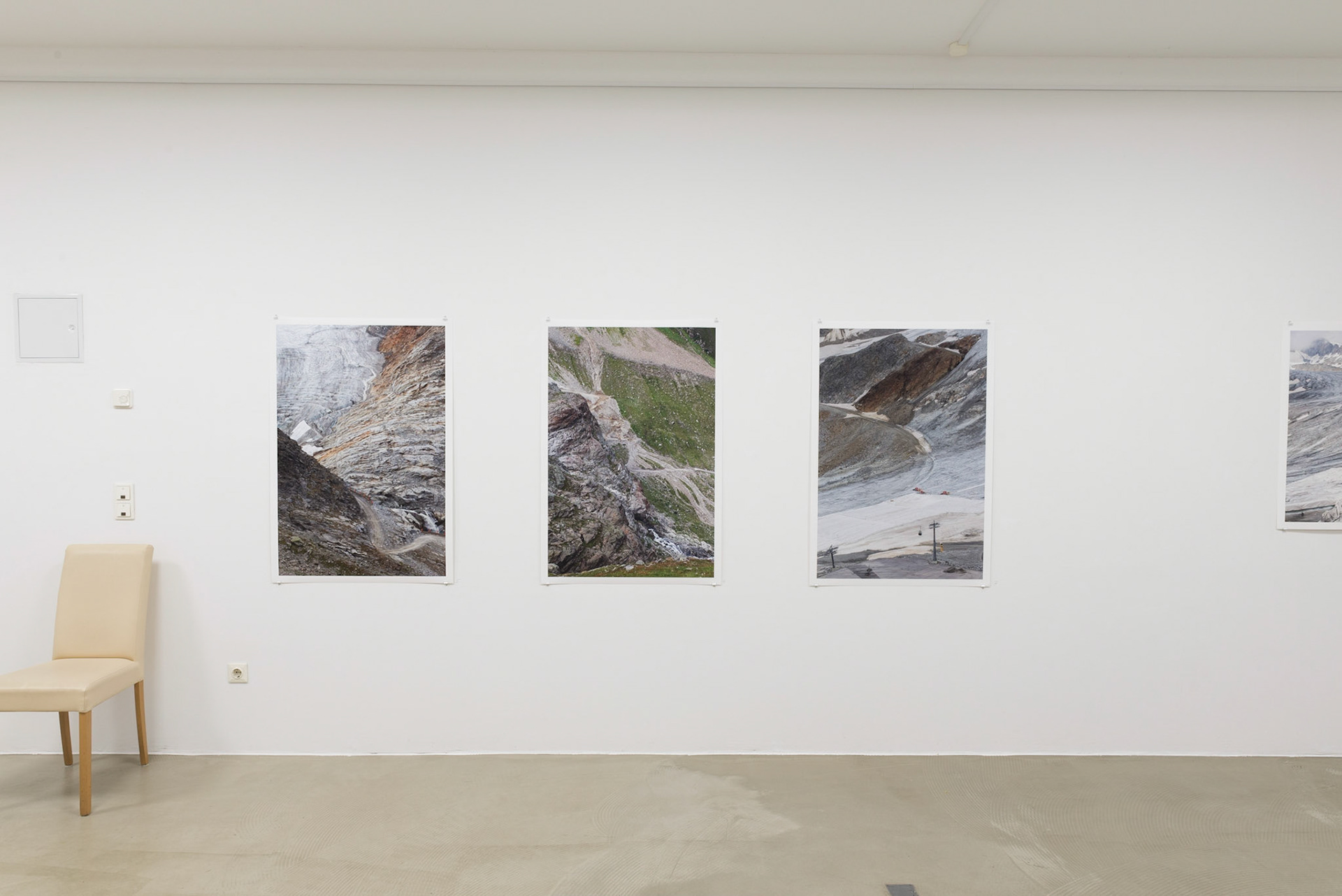 Mit dem ersten bewussten Erleben eines Gletschers aus direkter Nähe, es war die Pasterze in den Hohen Tauern, vor mittlerweile 12 Jahren kam ein Umbruch. Beeindruckt von der Schönheit und schieren Größe der Eis- und Felsformationen fotografierte er fortan fast ausschließlich Gletscher- und Berglandschaften. Sein eher sachlicher Blick richtet sich dabei auf die Erforschung der großflächigen Strukturen der Landschaften, die häufig fast zweidimensional abgebildet werden, ihre Materialität sowie auf die Größenverhältnisse zwischen dem Menschen, seinen Spuren und Einbauten und der Landschaft. Trotzdem lassen sich beim Näherkommen noch viele Details in den Bildern entdecken und zum Teil auch erst entschlüsseln. Die in der Ausstellung gezeigten farbigen Landschaftsaufnahmen spannen einen Bogen über diese Arbeitsperiode.
